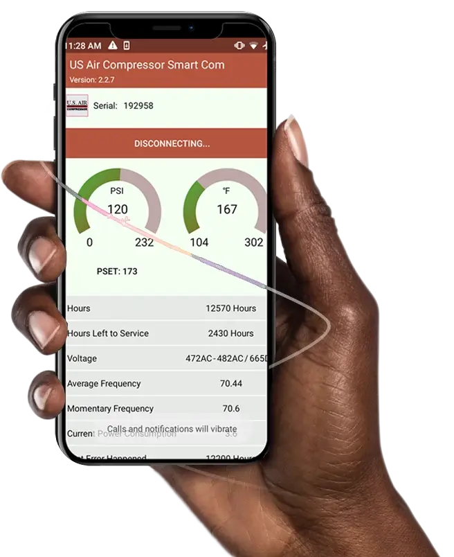 Get Connected to U.S. Air Compressor Cloud AI by using SmartCom App. SmartCom App can be downloaded from U.S. Air Compressor Website for IOS, Android and Windows operating system. Some compressor may not be equipped with IOS compatible bluetooth transmitters. Should IOS connection required for such compressors, IOS compatible bluetooth devices can be purchased from U.S. Air Compressor.